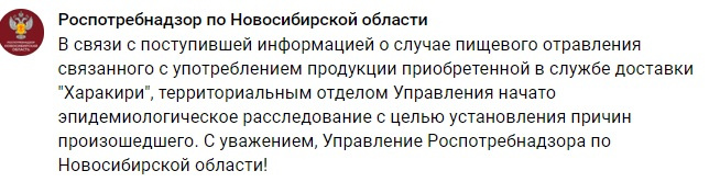 Днем 15 января в паблике «Новосибирск. Шлюз» появилась публикация, автор которой, Инга, обвинила «Харакири» в острой кишечной инфекции у ее семьи.