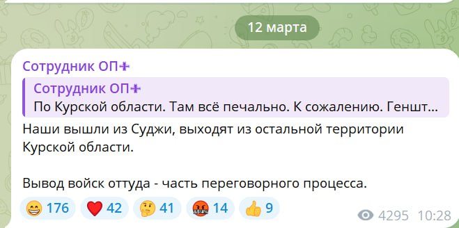 То есть якобы "глупые русские" вместо того, чтобы подождать несколько дней и дождаться, когда ВСУ само уйдет из Курщины "в рамках переговорного процесса", просто зря совершали свои подвиги.