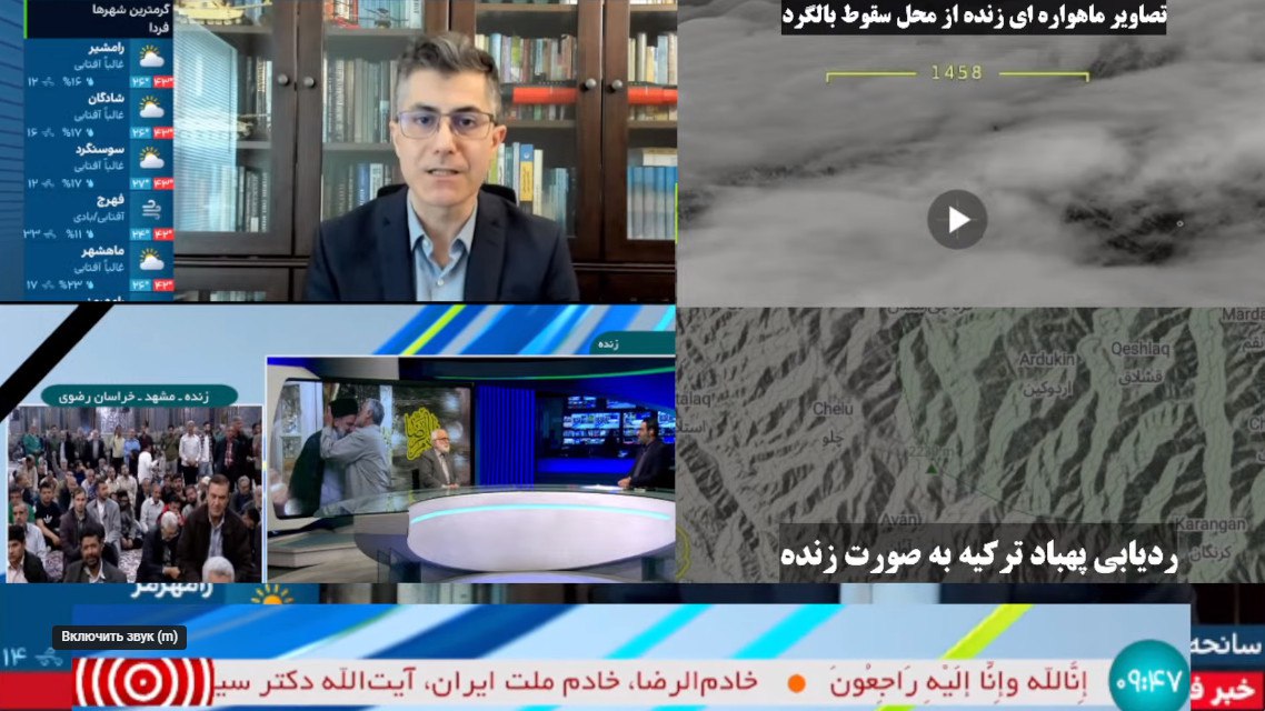 Фото из Тегерана. На скриншотах – эфиры иранских СМИ. Эксперты обсуждают текущую ситуацию и угрозы, которые появились в связи с гибелью президента. И лишь в небольшом окошке показана реакция народа. В мечетях, торговых центрах, на улицах люди будто в оцепенении.