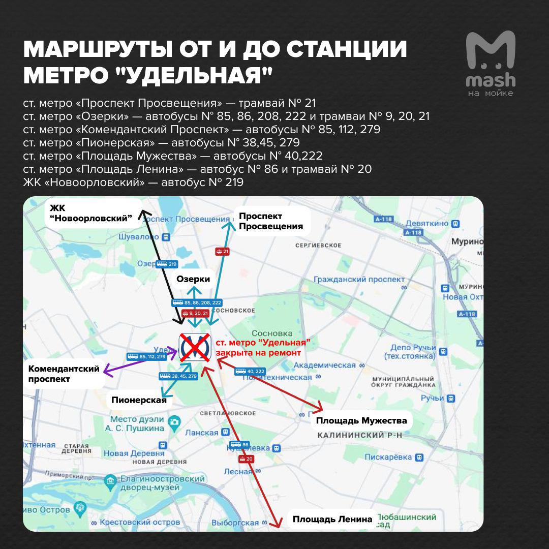 Весь поток пассажиров планируют перераспределить на соседей. Комитет по транспорту сообщает, что на время проведения работ на "Удельной" четыре автобусных маршрута специально продлили до соседних станций.