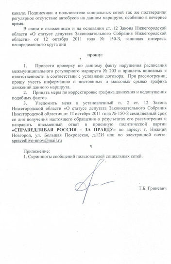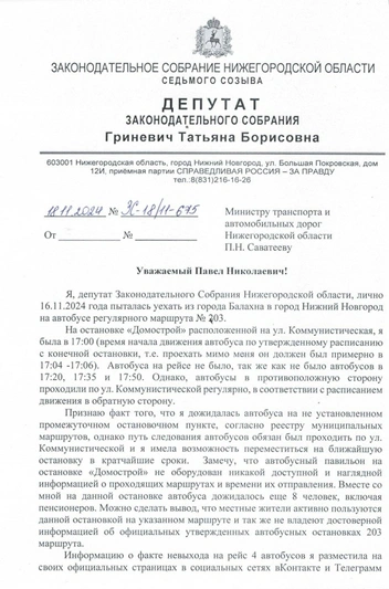 Депутат регионального заксобрания Татьяна Гриневич направила запрос министру транспорта Павлу Саватееву с просьбой провести проверку маршрута № 203 Балахна — Нижний Новгород. В выходные председатель областной фракции «Справедливая Россия» попыталась уехать от мамы домой, но прождала автобус полтора часа.