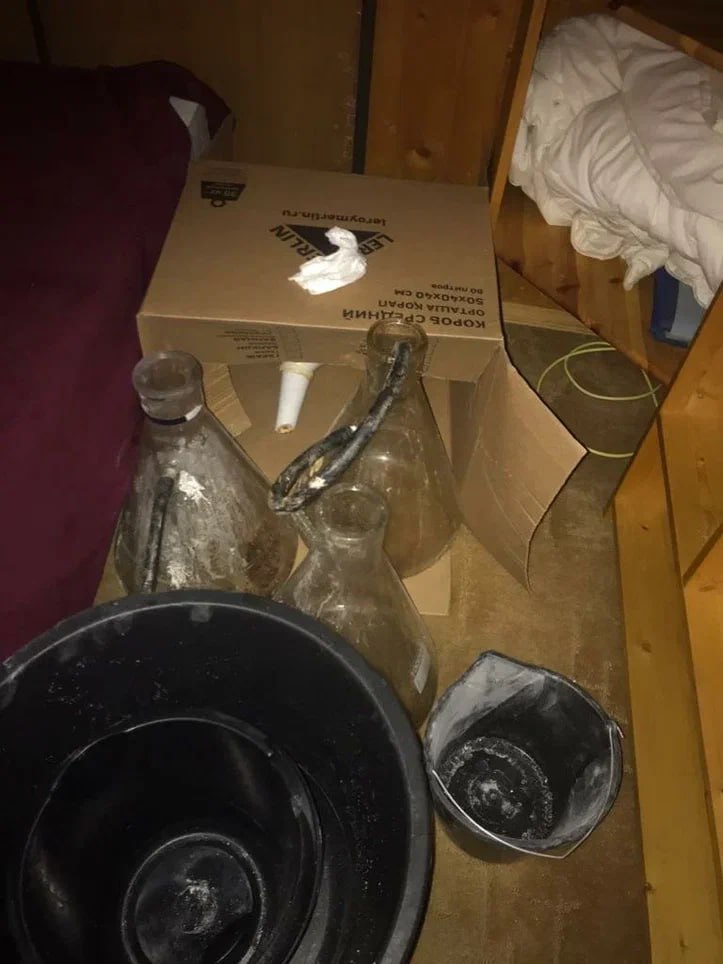 Правоохранители изъяли два пакета с кристаллическим веществом и 40 канистр реактивов. Экспертиза выявила, что в одном из пакетов находились 2 511,4 грамма мефедрона.