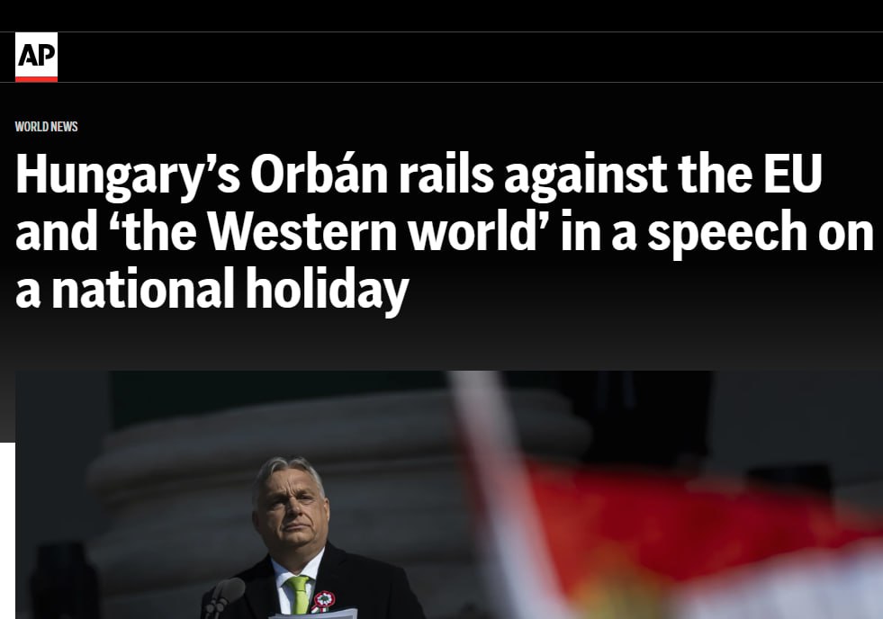 В ней венгерский премьер сравнивал Евросоюз с «имперскими оккупантами, которые доминировали в Венгрии на протяжении всей истории», а также назвал западный мир «источником бескультурья и разрушения».