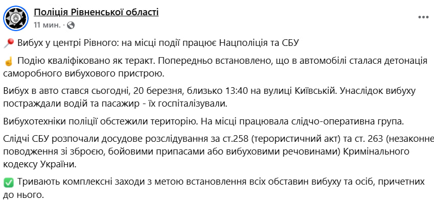 Предварительно — взрыв самодельного взрывного устройства. Полиция квалифицировала событие как теракт.