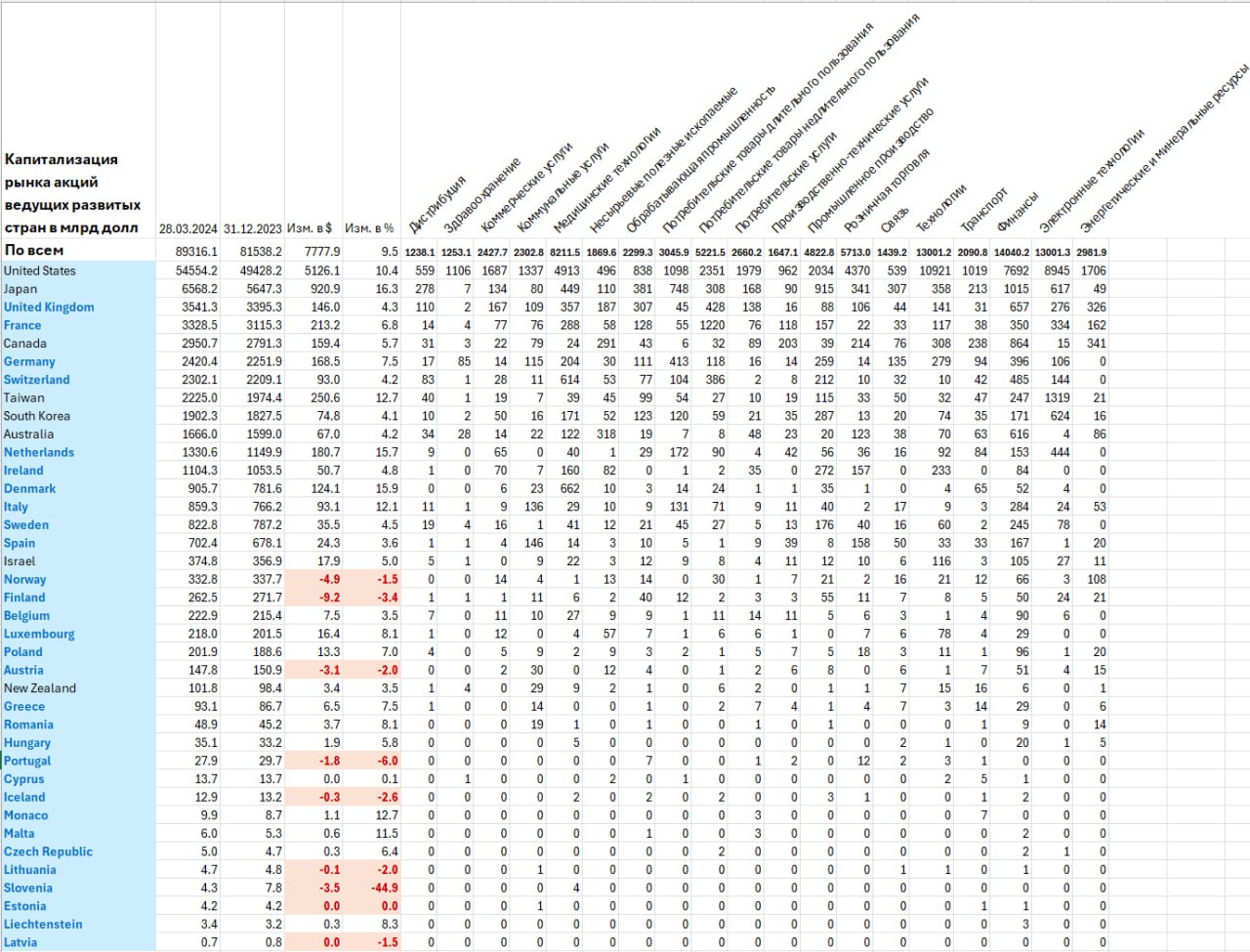 118.5 трлн долларов составляет капитализация глобального рынка акций, 89.3 трлн из которых (75.3% от общей капитализации) концентрируют США и ключевые союзники по актуальному курсу доллара на 1 апреля.