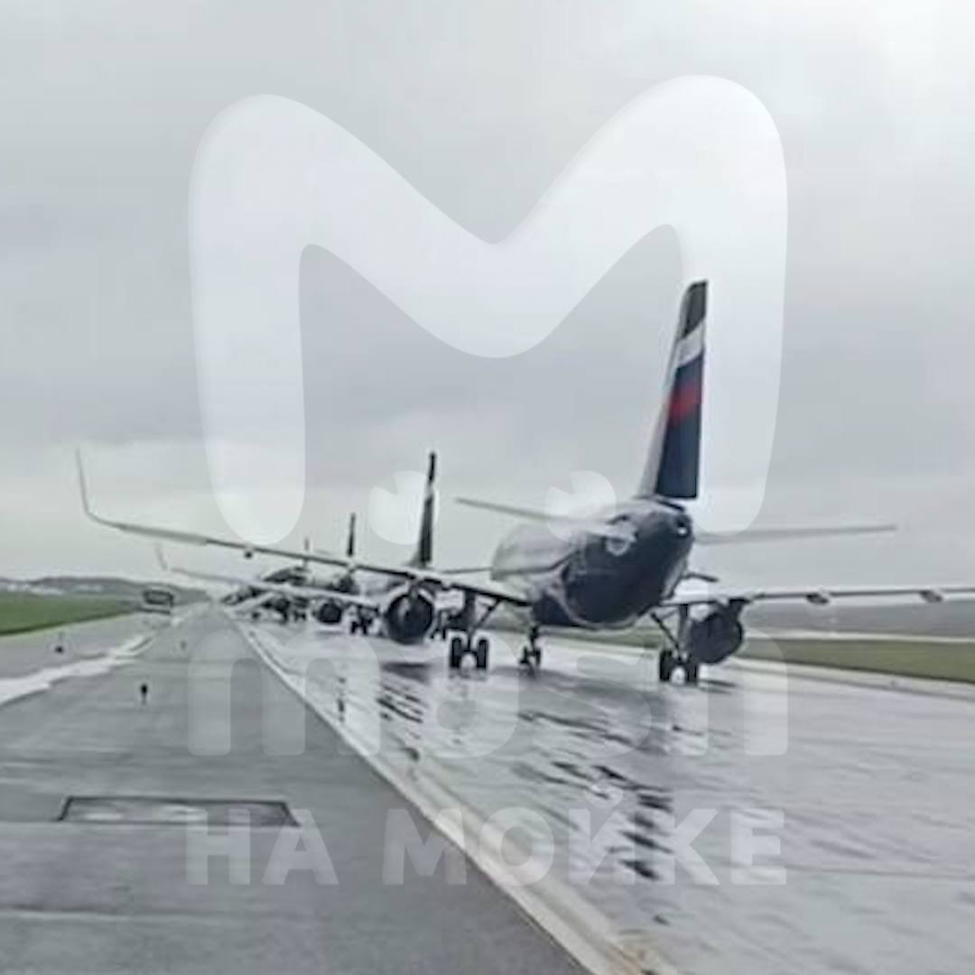 Наглядные фото и видео сегодняшней ситуации в Пулково — самолёты отстаивают свою очередь на вылет и постепенно отправляются по маршрутам.