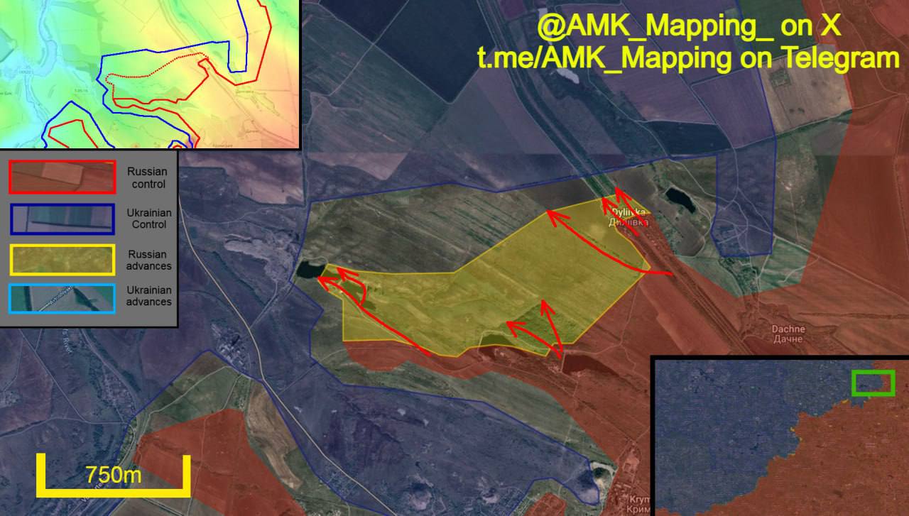 Российские войска продвинулись на северо-запад вдоль железнодорожной линии и завершили захват села Дылевка (южного). На западе удалось захватить лесополосу и пересечь водохранилище в низине, после чего захватить небольшой лес.