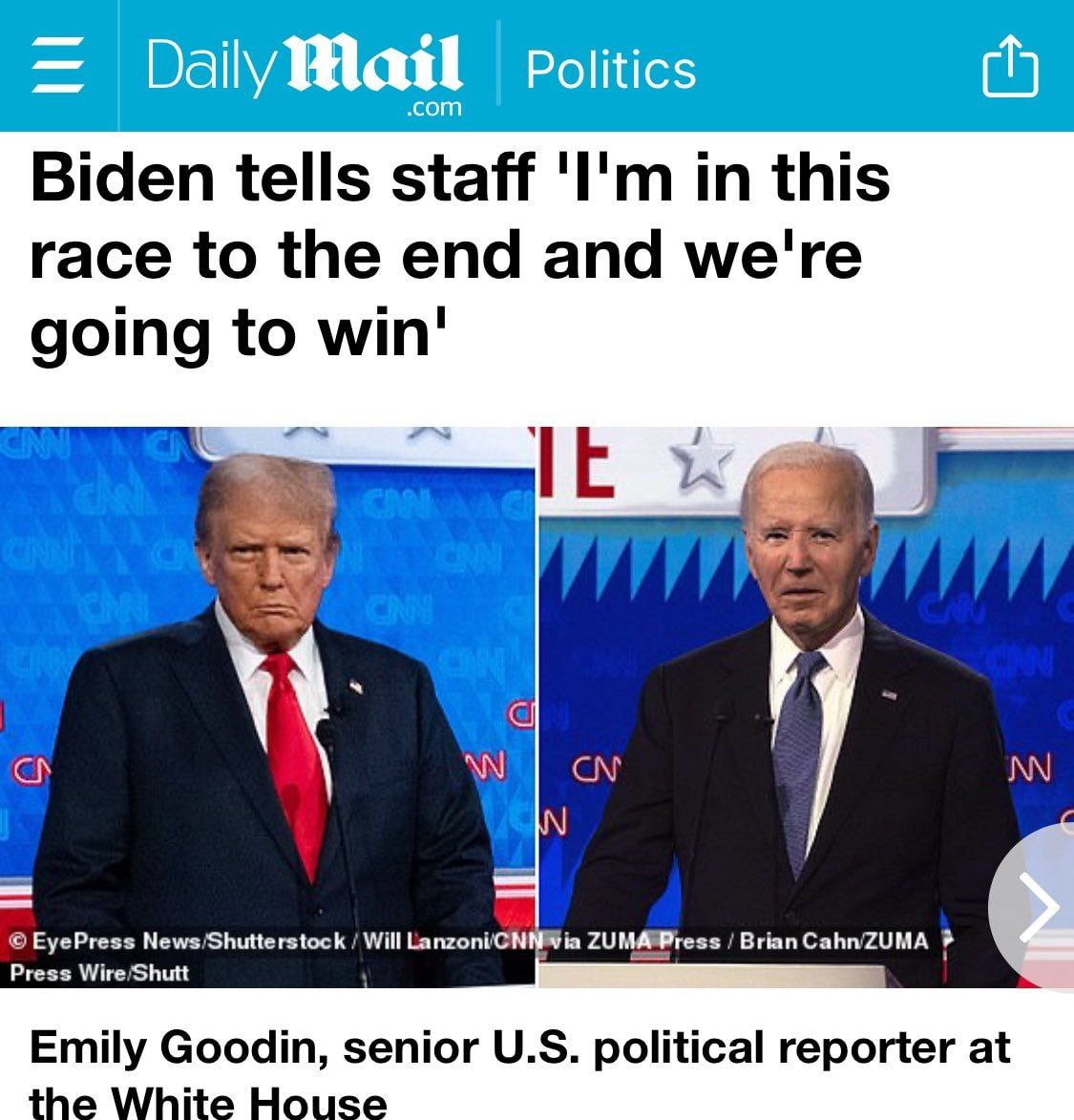 Новость о том, что Байден подтверждает, что не выбывает из борьбы и участвует в президентской гонке до конца, главная в эти минуты. А цитата заявления президента США, впервые опубликованная в Politico (в заголовке поста) уже расходится на мемы.