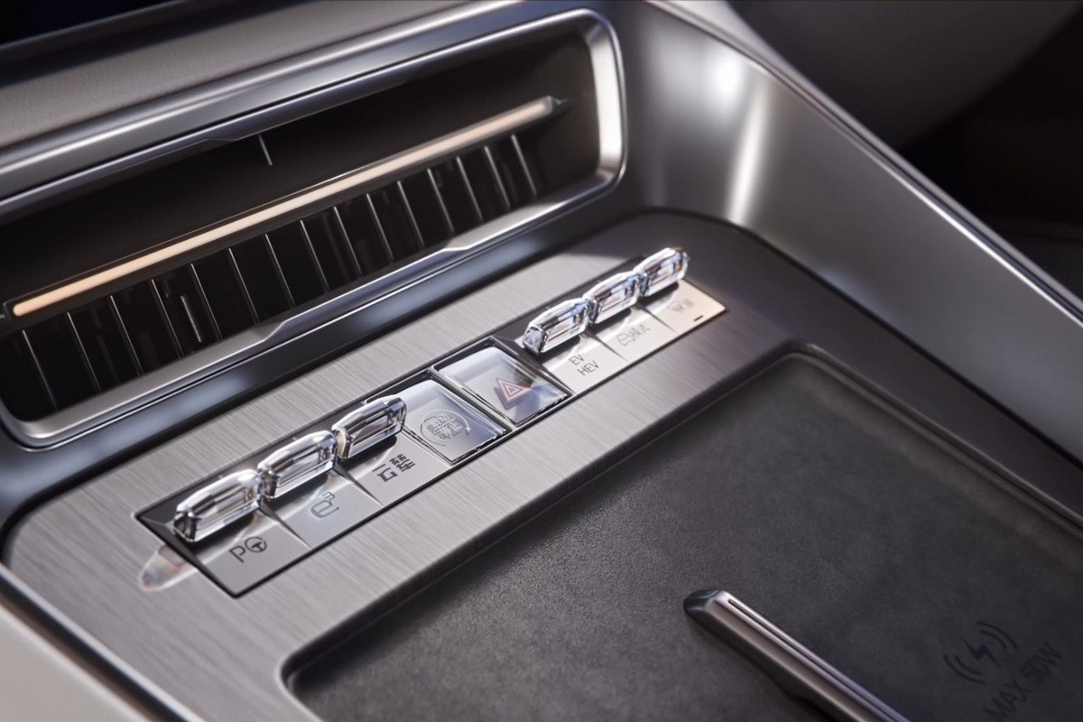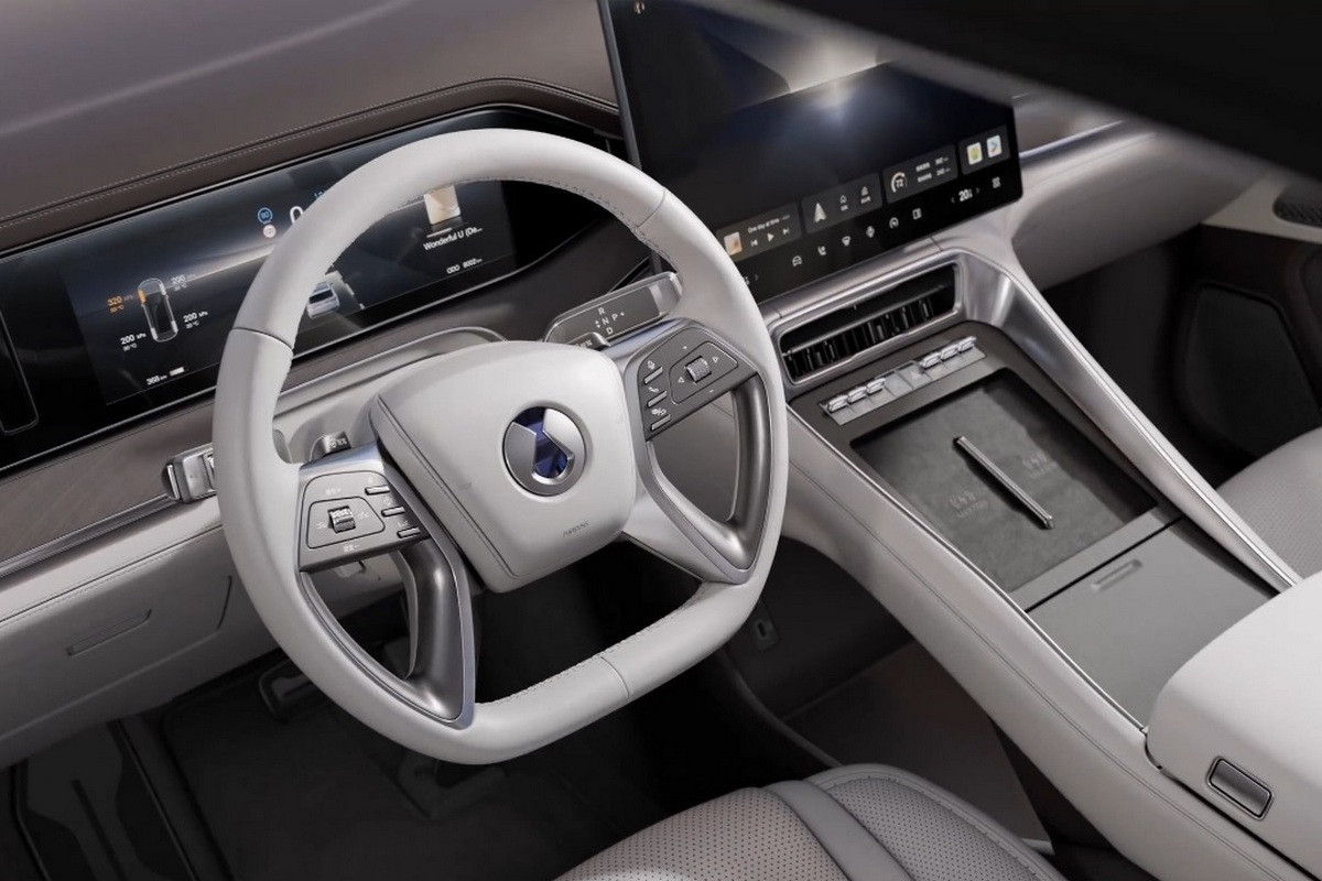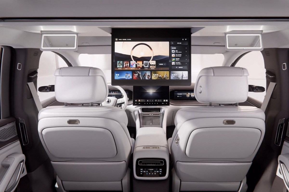 Передняя часть салона N9 оформлена в стиле представленных недавно гигантского хэтчбека Denza Z9 GT и седана Denza Z9. На панели – три отдельных экрана, причем центральный планшет возвышается над ней. Для задних пассажиров предусмотрен собственный дисплей – он крепится к потолку. На центральном тоннеле расположены две площадки для беспроводной зарядки. Клавиши и рычажки сделали «хрустальными».