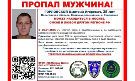 35-летний житель города Красавино Великоустюгского округа Горловской Дмитрий Игоревич утратил связь с родственниками 26 января этого года.