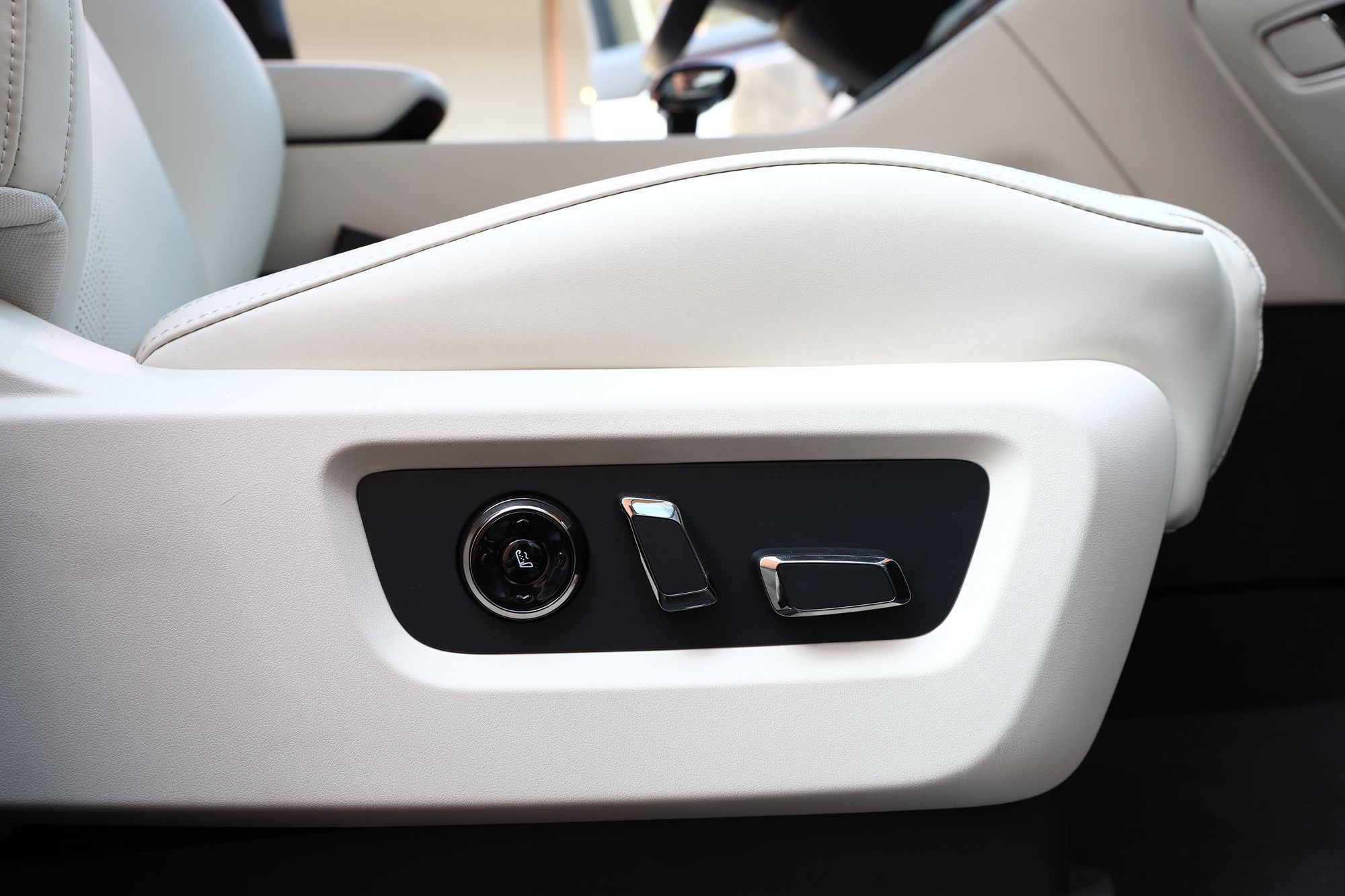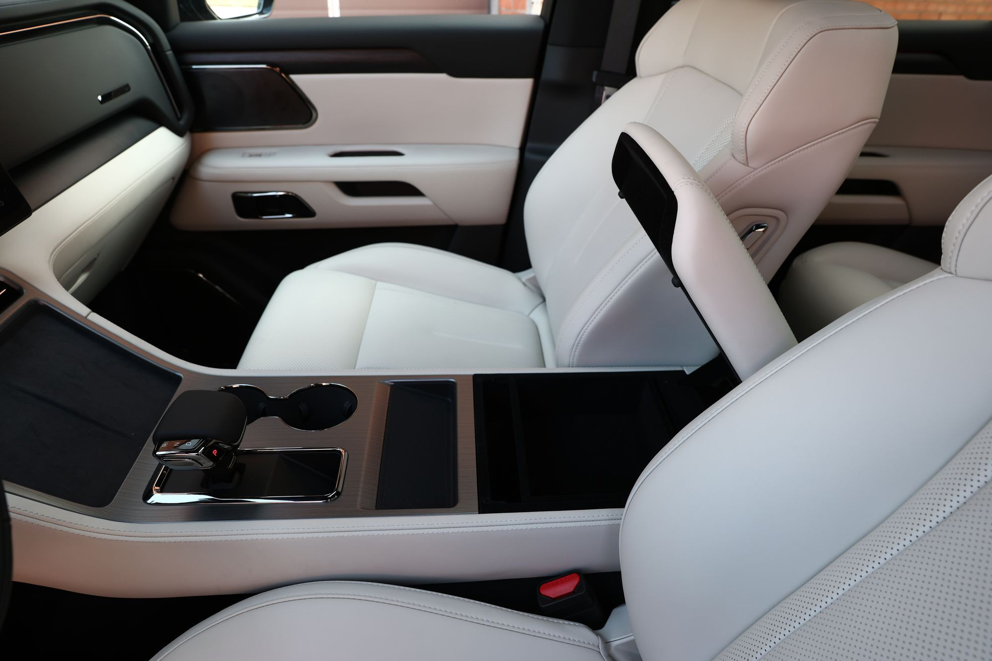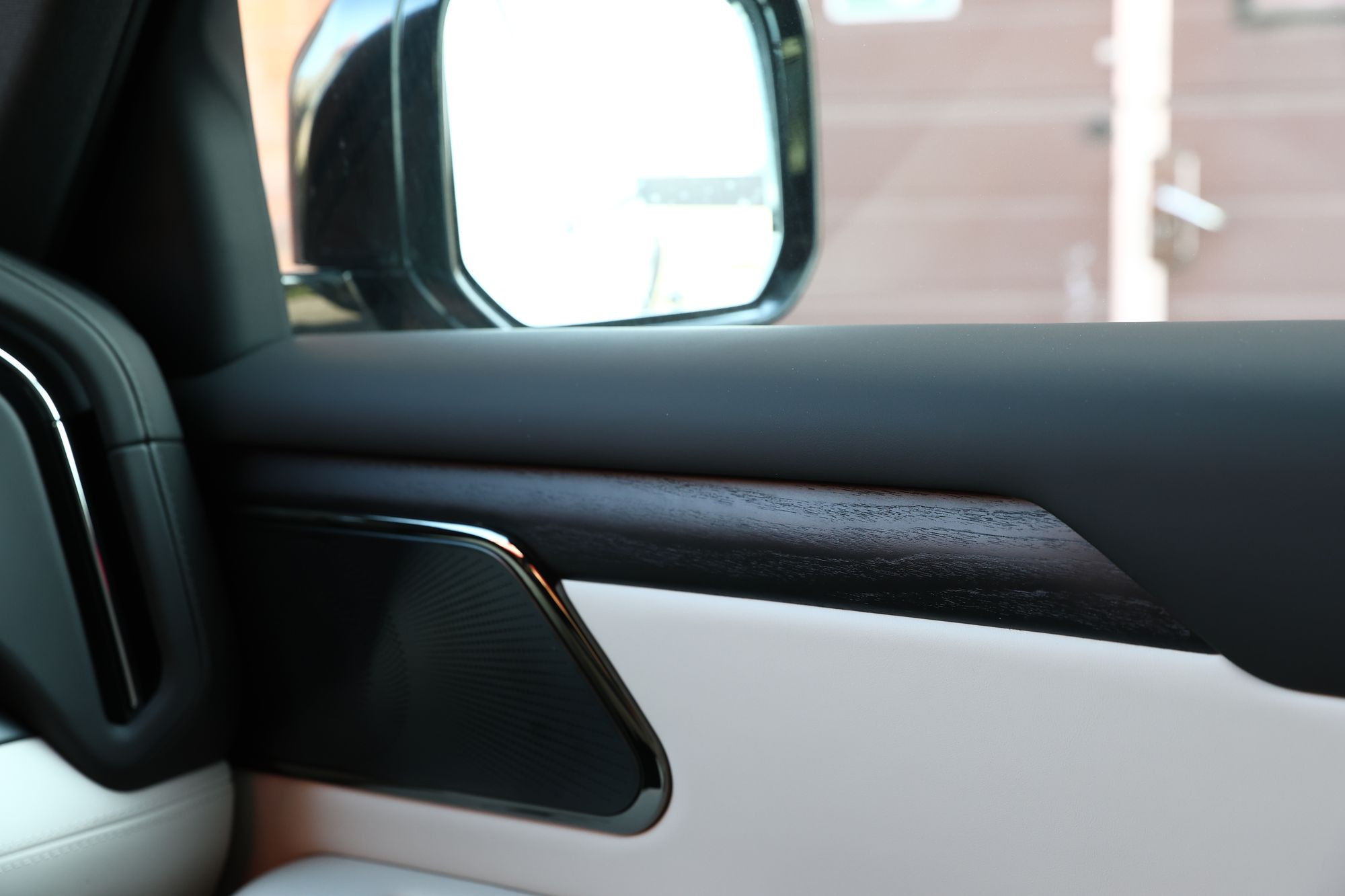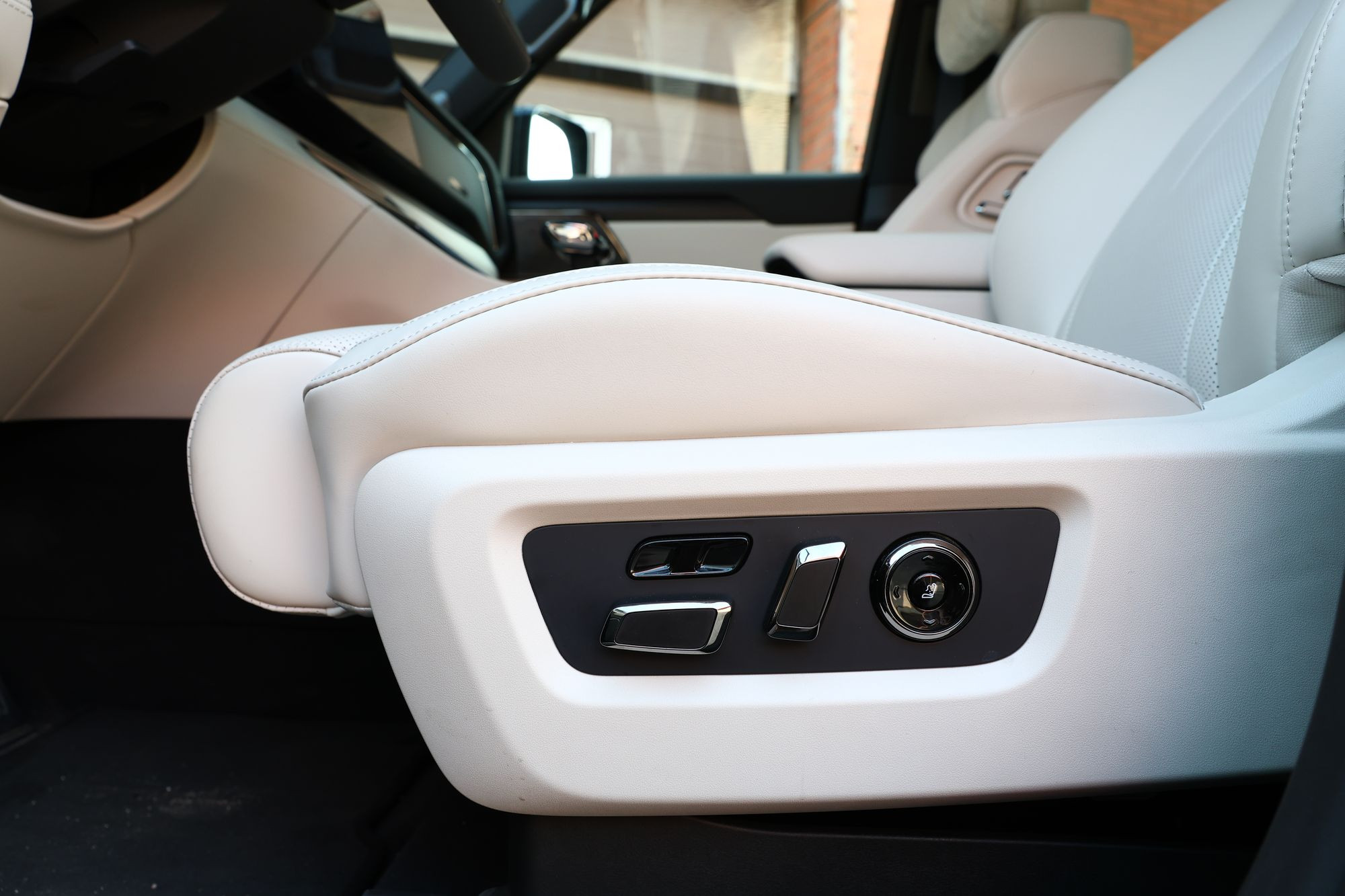 К водительскому креслу не придраться – здесь есть регулировки и угла наклона подушки, и её длины. У переднего пассажира, как водится, настроек минимум, не говоря уже про отсутствие оттоманки. Посадка подчёркнуто вертикальная, прямо как на Range Rover. Панель приборов – 12,3-дюймовый экран, у которого, по сути, никаких настроек нет. Посередине тут, конечно же, нарисованы машинка и анимированная дорога, а сверху – небольшие цифры спидометра.
