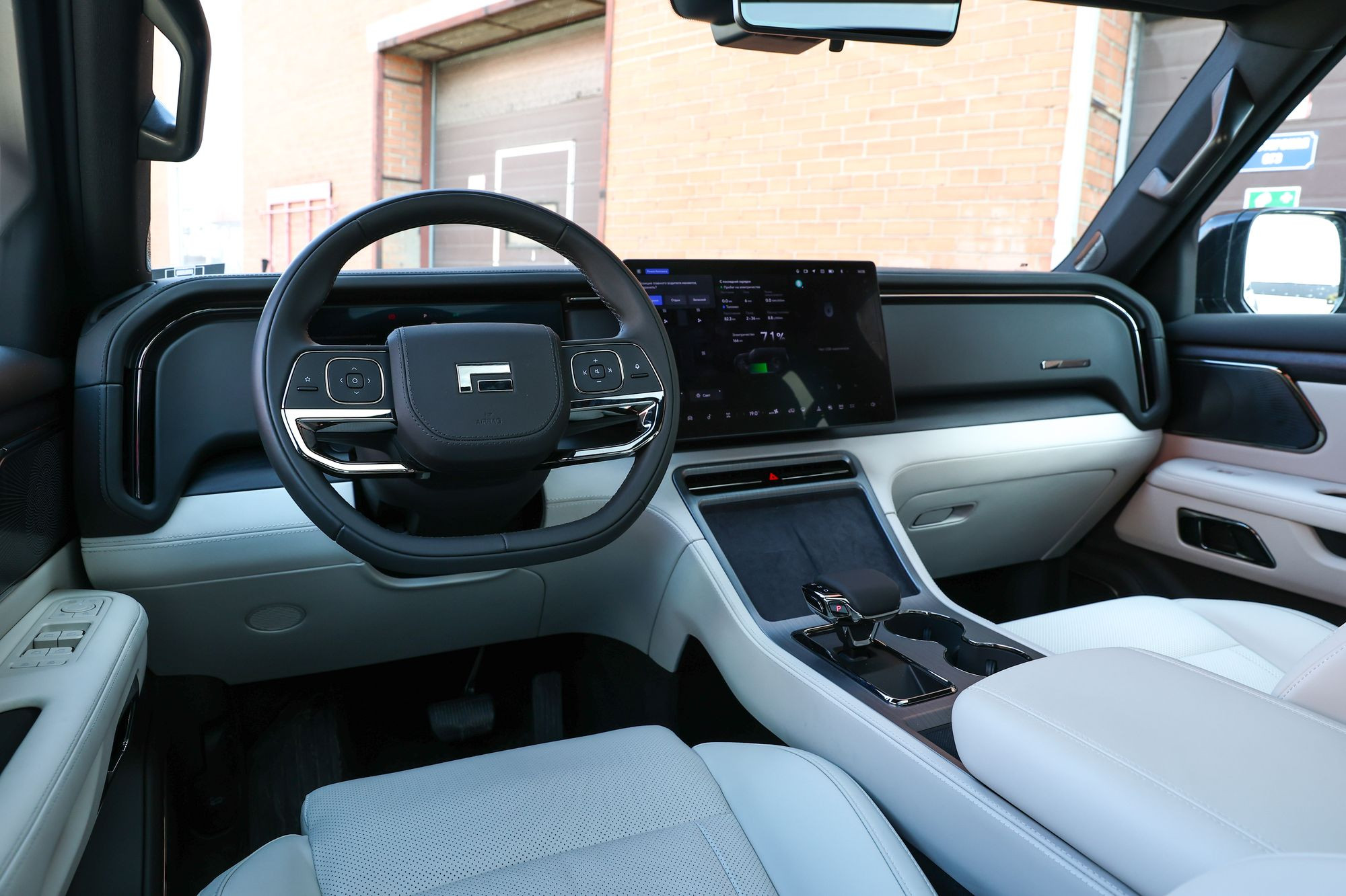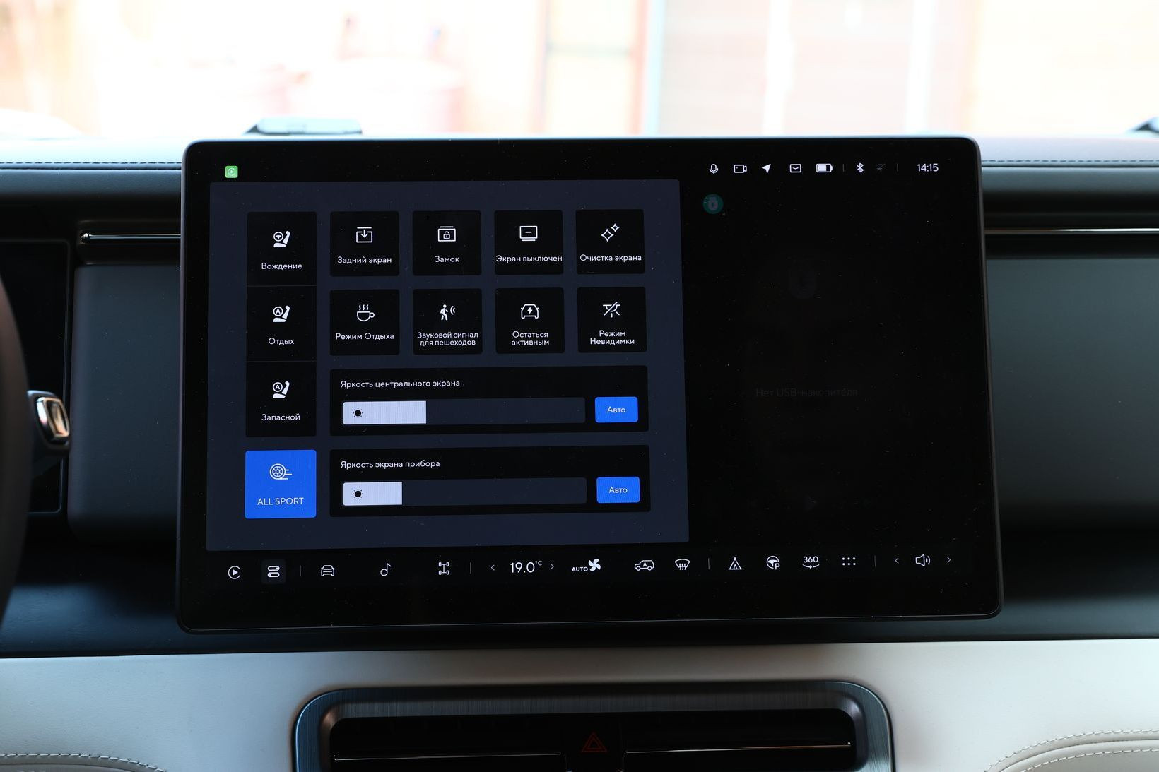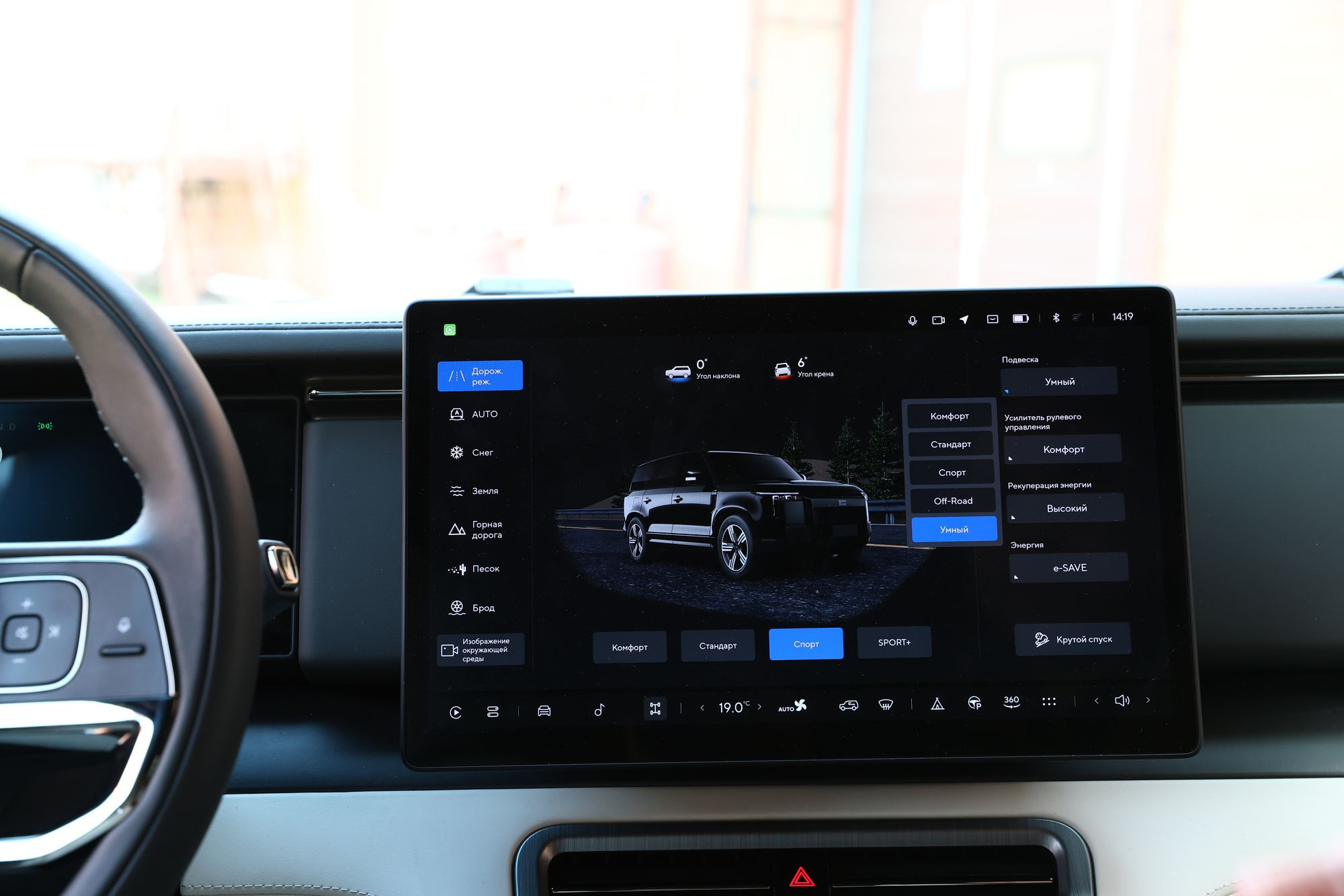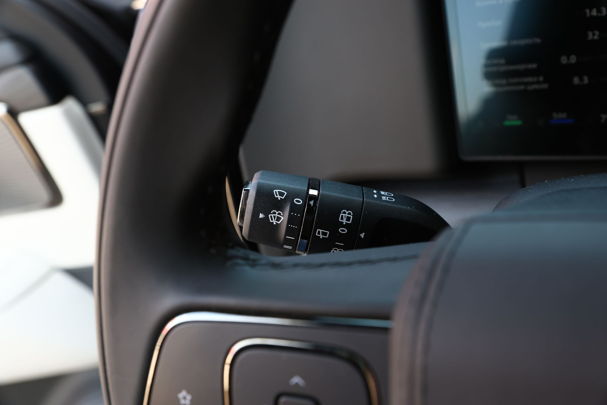 Интерьер в «ноль-первом» тоже британский: плоская передняя панель, двери с широкими подоконниками, минималистичный дизайн. Только дисплей, не считая «приборки», всего один – 15,7-дюймовый тачскрин, в который упаковали всё. Даже управление головным светом, как на Jetour Dashing, потому что левый подрулевой переключатель управляет «дворниками», а правый – адаптивным круиз-контролем. И это неудобно.