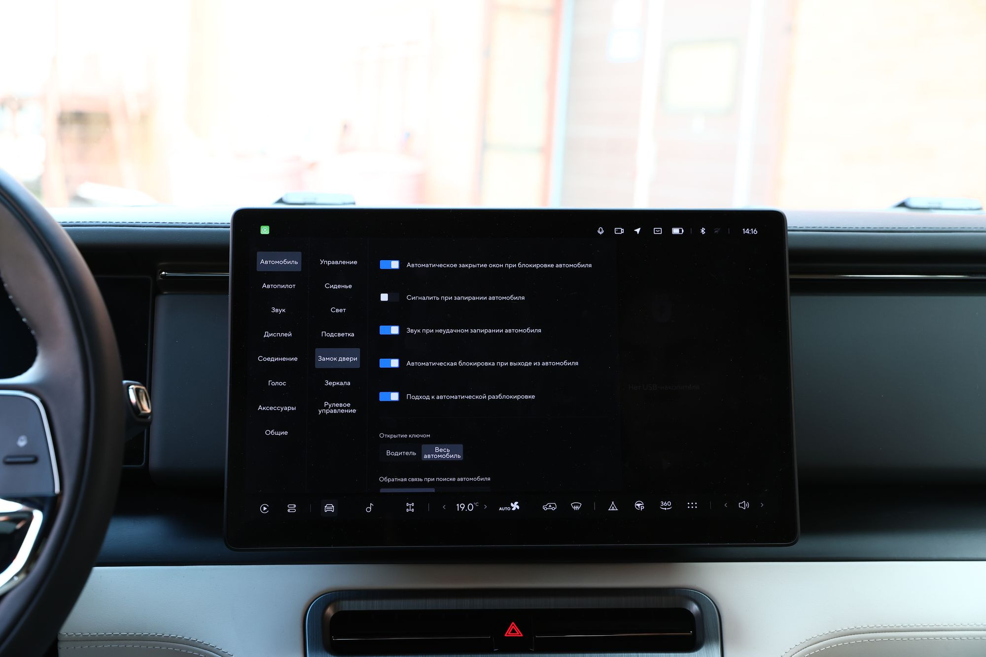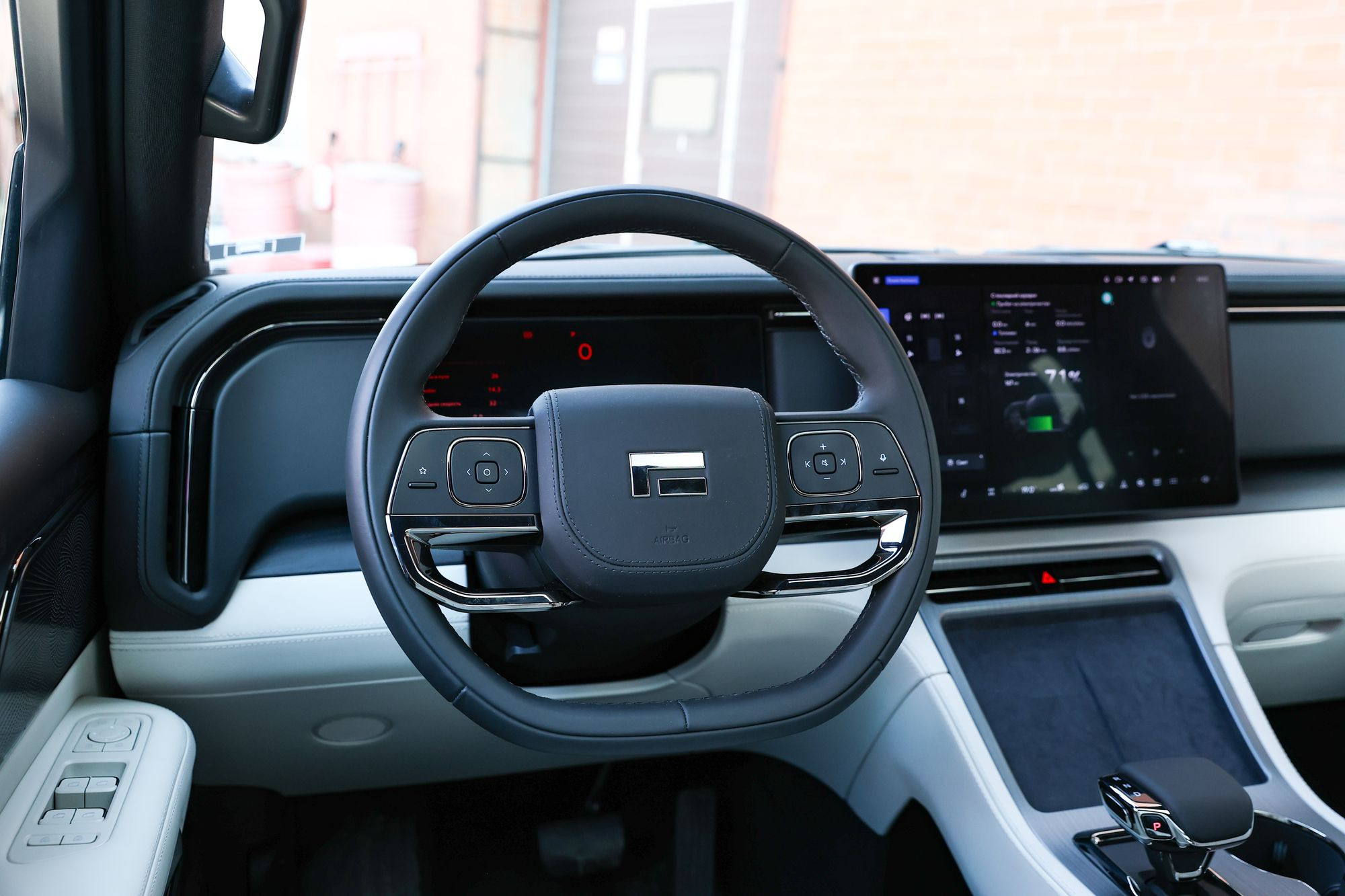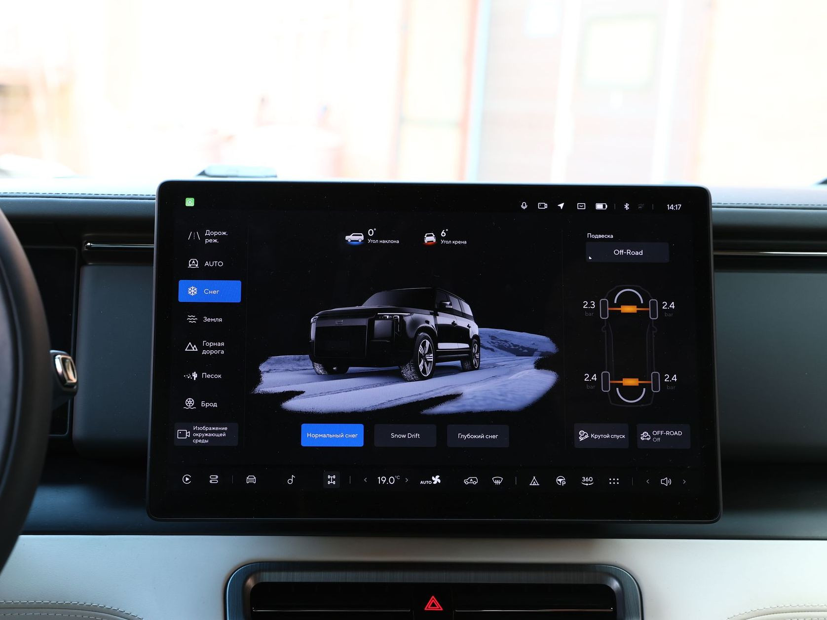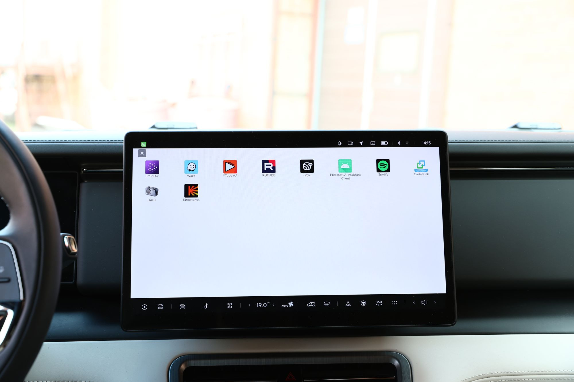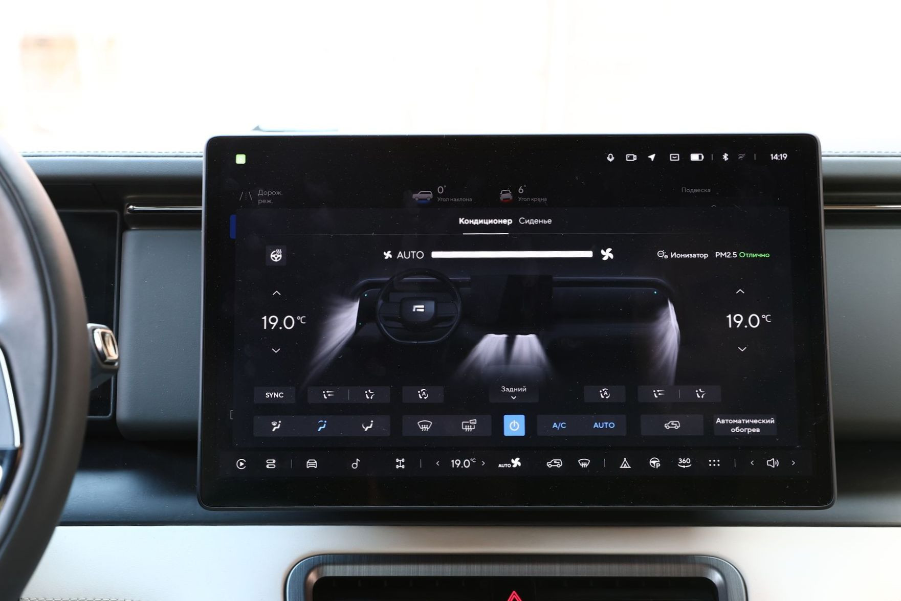 Интерьер в «ноль-первом» тоже британский: плоская передняя панель, двери с широкими подоконниками, минималистичный дизайн. Только дисплей, не считая «приборки», всего один – 15,7-дюймовый тачскрин, в который упаковали всё. Даже управление головным светом, как на Jetour Dashing, потому что левый подрулевой переключатель управляет «дворниками», а правый – адаптивным круиз-контролем. И это неудобно.