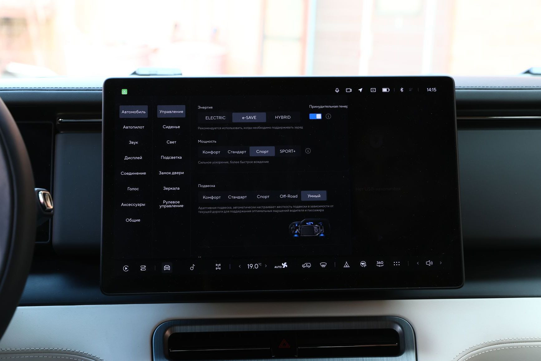 Предусмотрены три режима работы гибридной установки: исключительно электрический Electric, режим принудительной зарядки батареи от бензинового мотора e-Save и автоматический Hybrid, в котором электроника сама решает, когда запускать ДВС и сколько топлива нужно потратить на пополнение ёмкости аккумуляторов. Границы разрядки и зарядки батареи можно настраивать вручную, и это удобно: в зависимости от условий движения можно отдать приоритет сжиганию бензина или опустошению батареи.