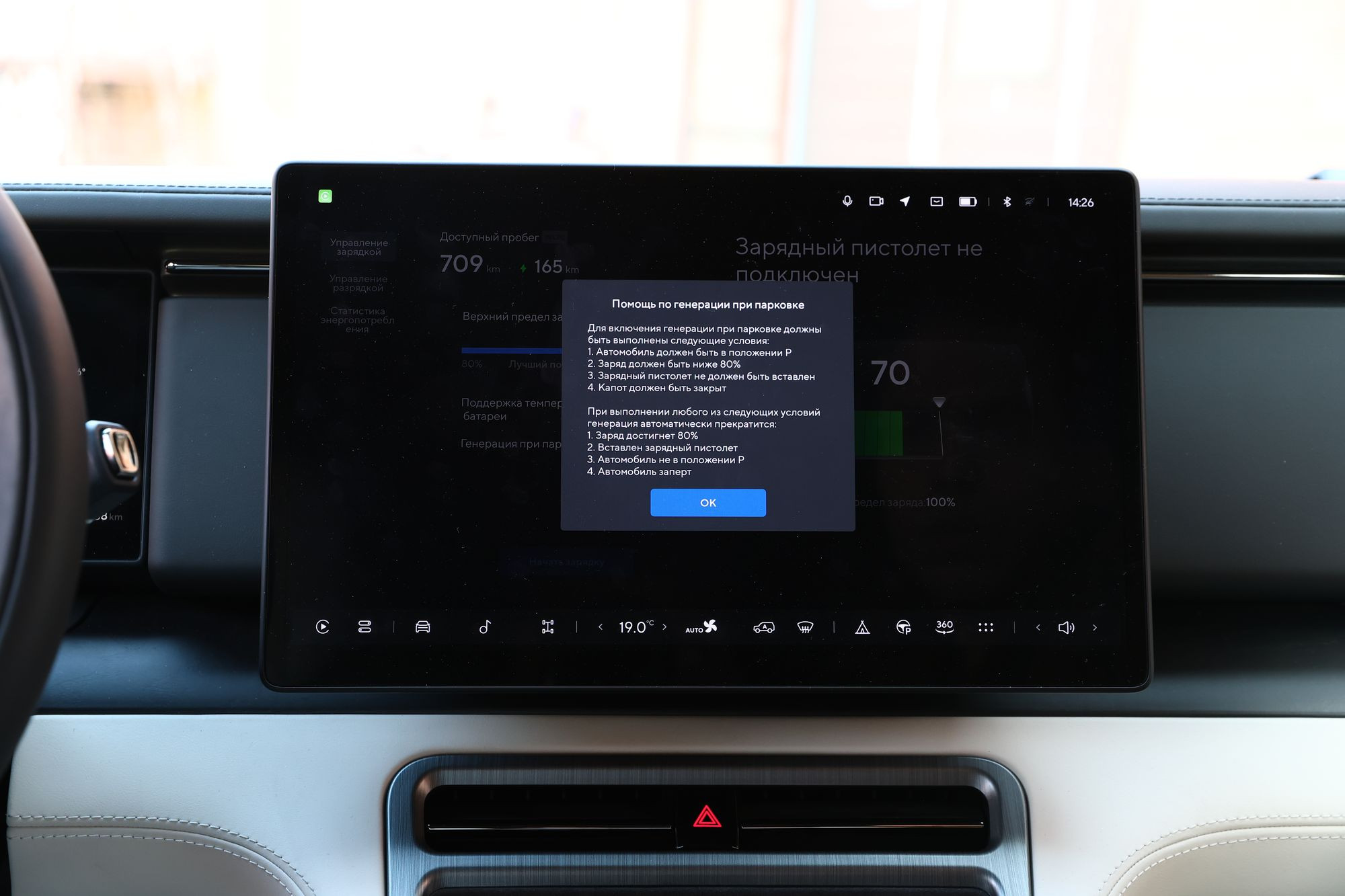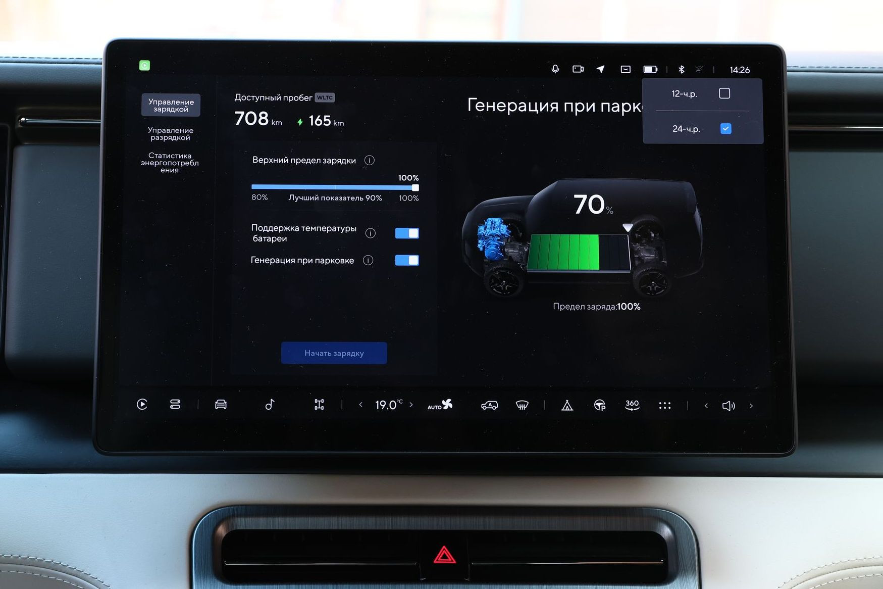 Есть в меню и отдельный переключатель для зарядки батареи на стоянке. В этом случае мотор будет постоянно молотить на холостых оборотах, но почему-то эта функция работает только с сидящим внутри водителем. Стоит ему открыть дверь – двигатель глохнет. Если нужно, скажем, прогреть салон перед поездкой, то в меню есть пункт «Остаться активным», который не позволит машине выключиться после закрытия дверей. Но ДВС работать не будет и в этом случае, а включенным останется только бортовое питание. Ведь никакой отдельной кнопки запуска мотора тут нет – для этого надо просто нажать на педаль тормоза. Зато в меню есть «Режим невидимки», при активации которого в салоне погаснут все экраны.