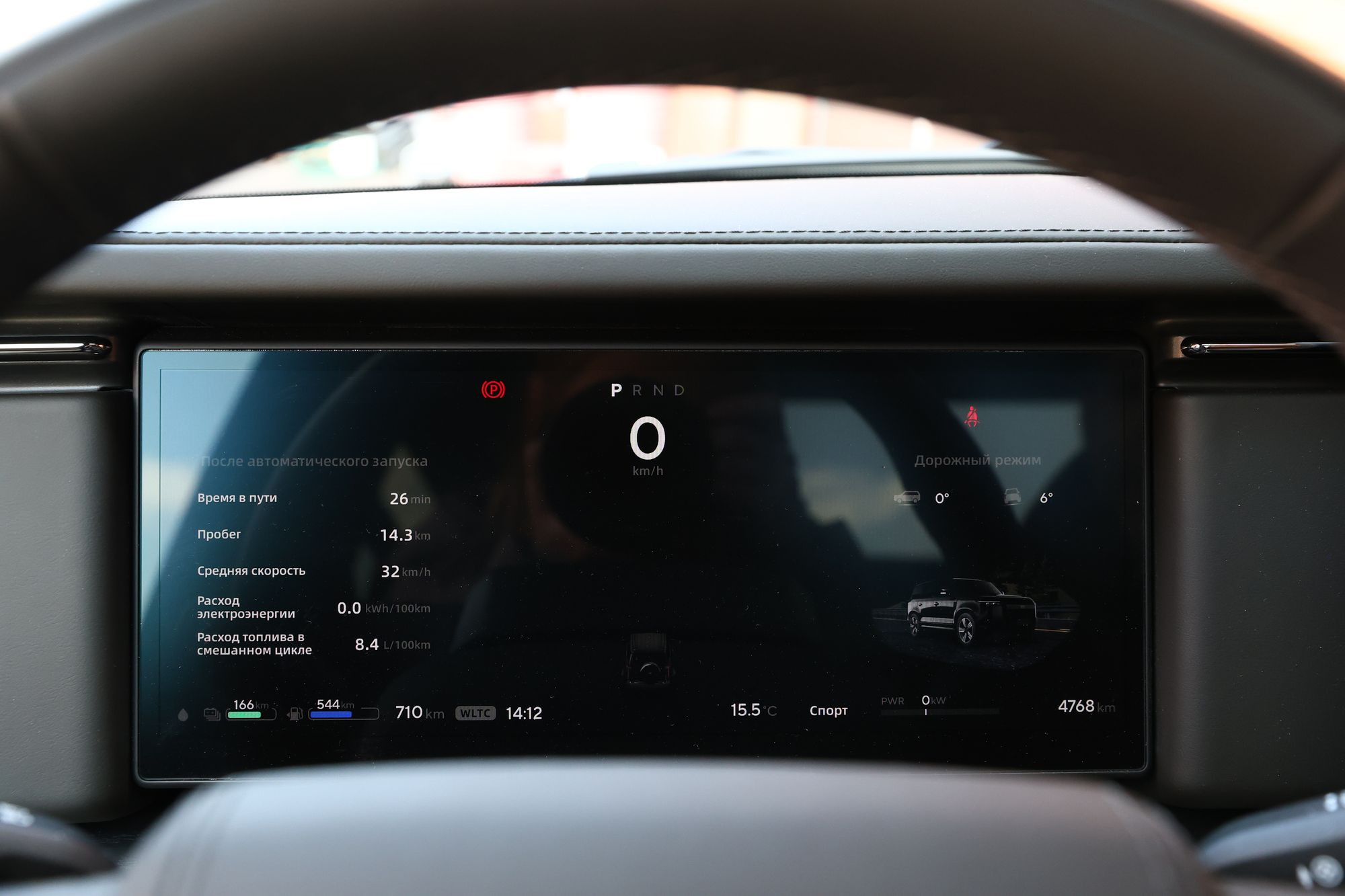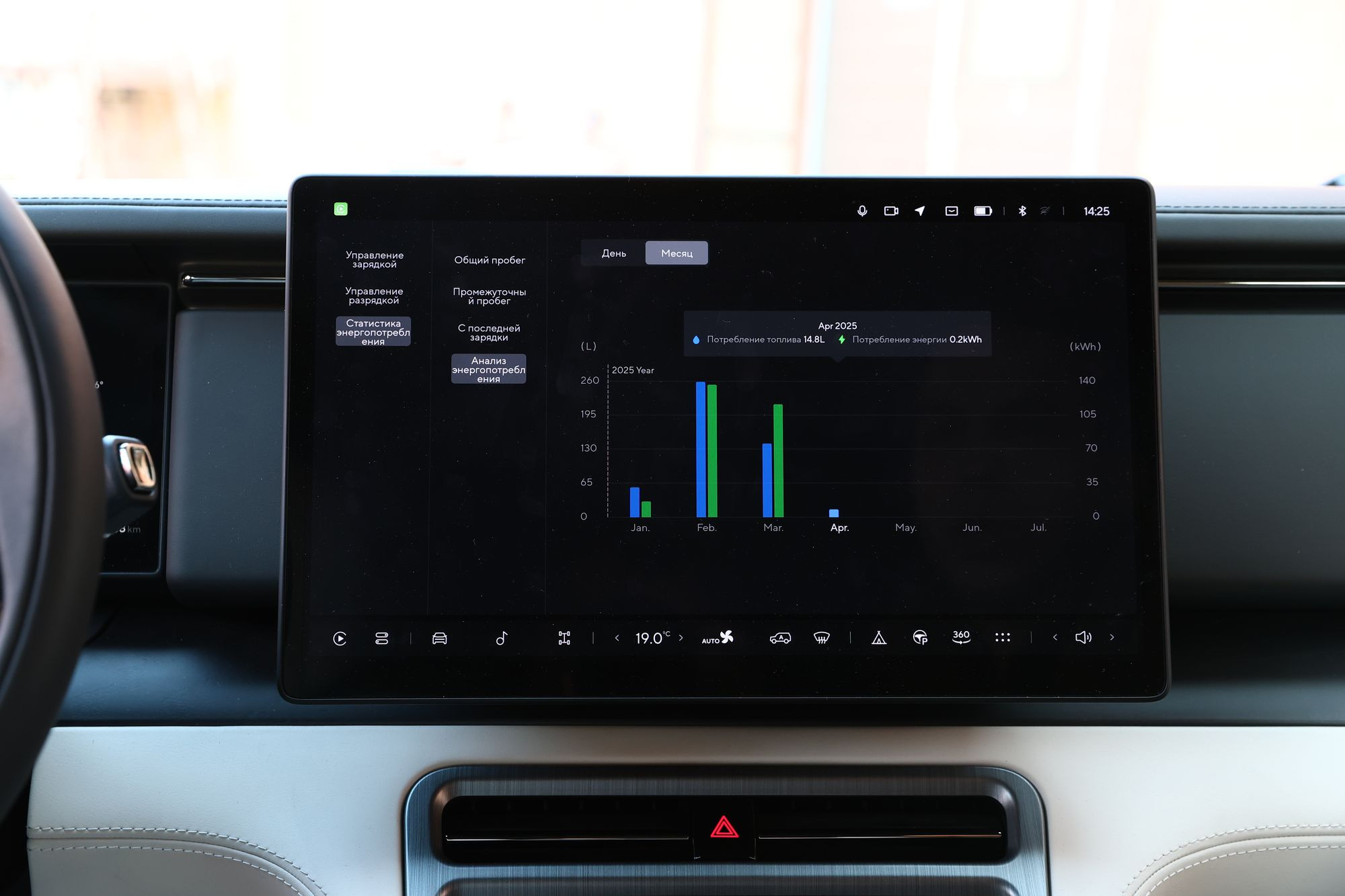 К тому же в мультимедийной системе есть раздел «Статистика энергопотребления», где подробнейшим образом описывается, сколько автомобиль проехал на бензине, сколько – на электричестве, и даже на что именно были потрачены эти ресурсы. Из этой статистики мы узнали, что тестовый «ноль-первый» намотал на одометр 4914 километров, 4326 из которых он проехал на топливе и 588 – на электротяге. Средний расход бензина составил всего 10,1 литра на 100 км, средний расход электричества – 25,4 кВт·ч на сотню. Заявленный совокупный запас хода между тем – 1115 км по циклу WLTP.