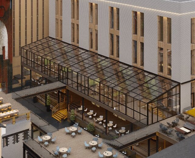 К весне 2026 года в общественном пространстве планируют открыть несколько танцевальных школ, рестораны в фасадной части здания, панорамный ресторан-клуб, несколько площадок для проведения мероприятий, лекторий, кинозал и фитнесс клуб сети New Fit.