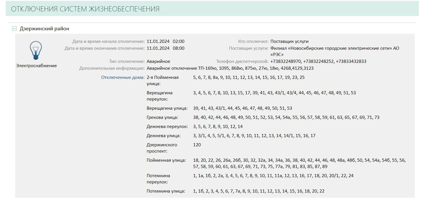 На сайте Систем жизнеобеспечения Новосибирска на утро 11 января отсутствует информация об аварийном отключении теплоснабжения, при этом указано, что в 195 домов в Дзержинском районе Новосибирска не подается электроэнергия из-за аварии.