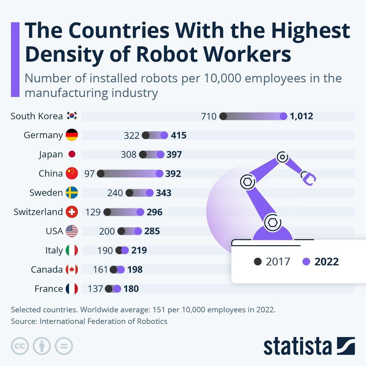 Отметим, что по предварительным данным за первое полугодие 2024 года, Китай вышел на уверенное второе место с 585 роботами, а Япония обошла Германию, которая теперь замыкает топ-4.