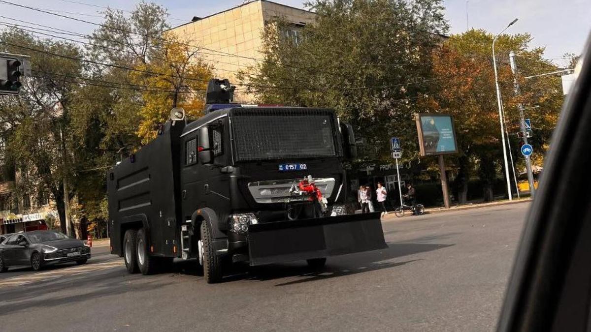 На фото запечатлен черный грузовик с установленным водометом, говорят казахстанцы.