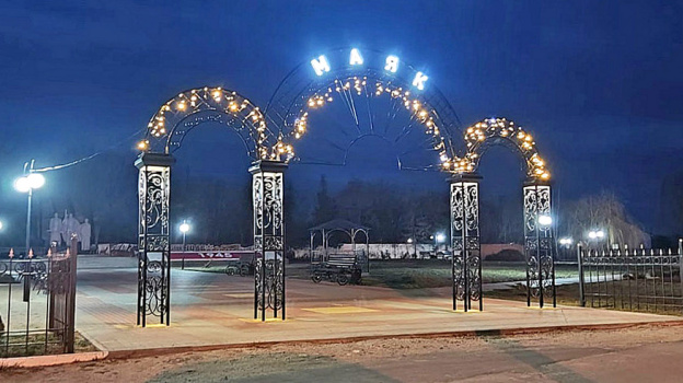 Металлическую кованую арку с колоннами и названием «Маяк» установили на центральном входе. Ее высота – 5 м. Буквы подсвечиваются в вечернее время.