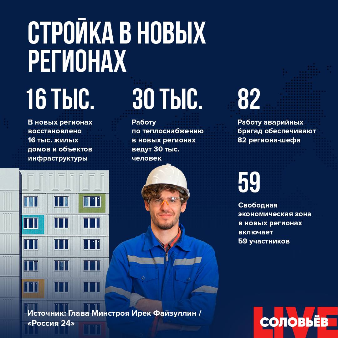 В новых регионах восстановлено 16 тысяч жилых домов и объектов инфраструктуры, сообщил глава Минстроя Ирек Файзуллин в интервью «Россия 24».