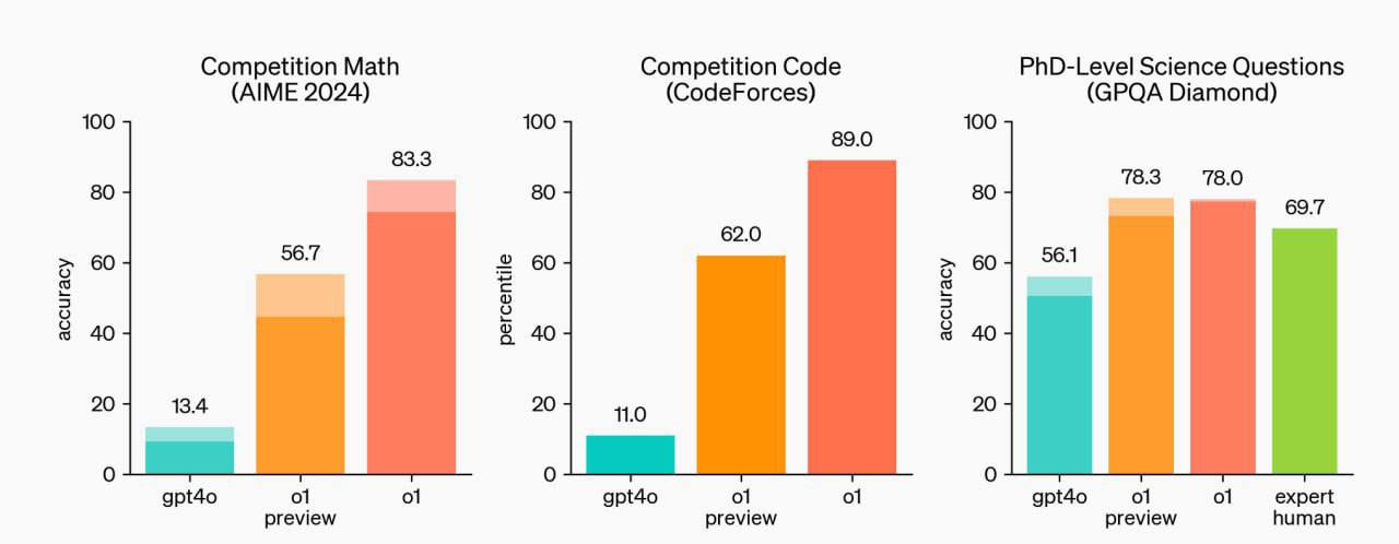 OpenAI выпустили новую модель искусственного интеллекта под названием o1. Это первая модель, которая умеет «думать».Судя по показателям, o1 в разы превосходит последнюю GPT Разработчики сделали нейросеть такой, чтобы она решала очень сложные задачи быстрее, чем человек.Обучение, лежащее в основе o1, принципиально отличается от его предшественников, потому что обучена с использованием совершенно нового алгоритма.С практической точки зрения она в 8 раз лучше справляется с написанием кода и решением многошаговых задач, чем предыдущие модели. Главная особенность – умение «размышлять». Её результаты максимально близки к ответам людей с учёной степенью