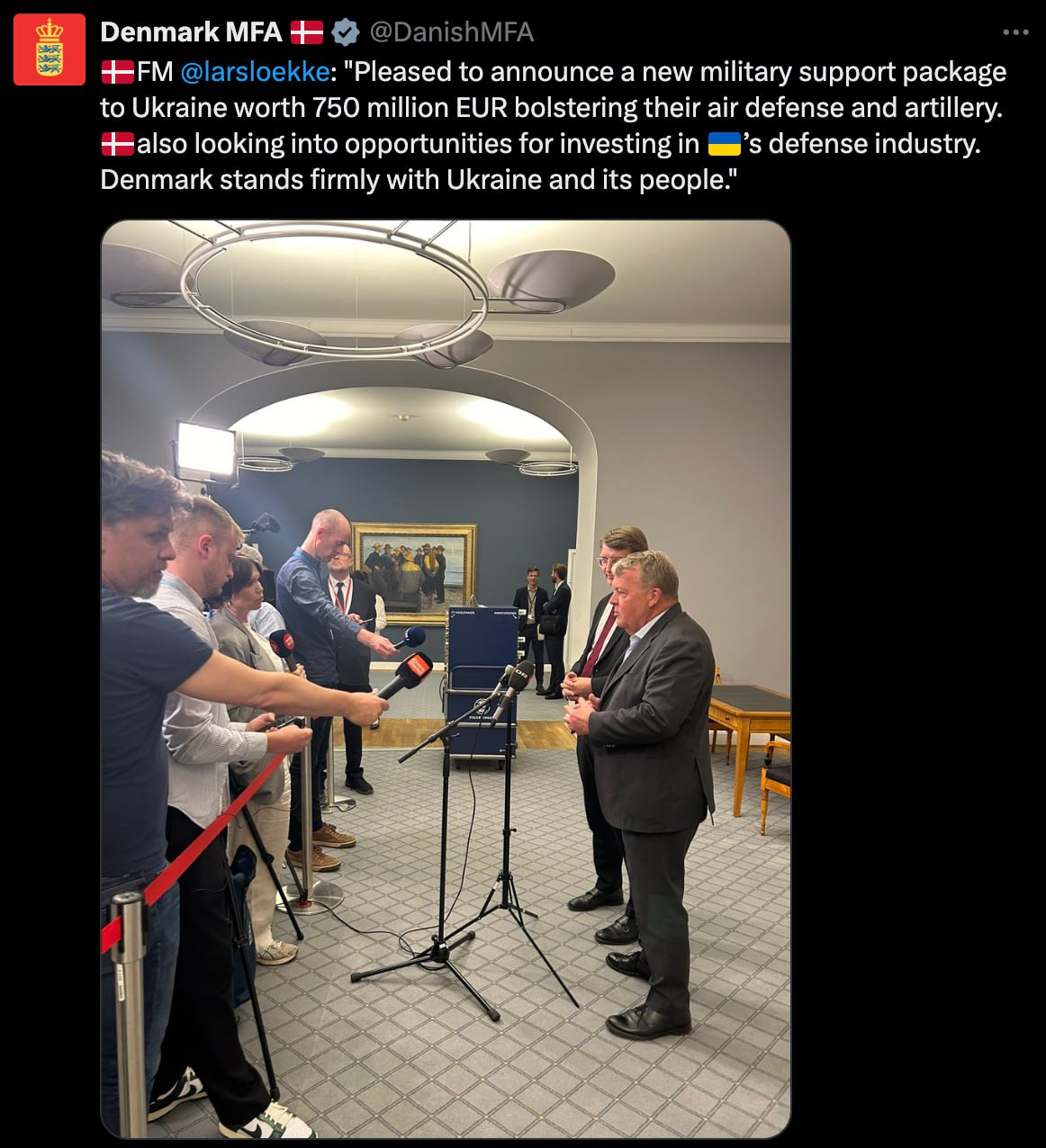Дания объявила о новом пакете военной помощи для Украины на €750 млн (около 74,2 млрд рублей).
